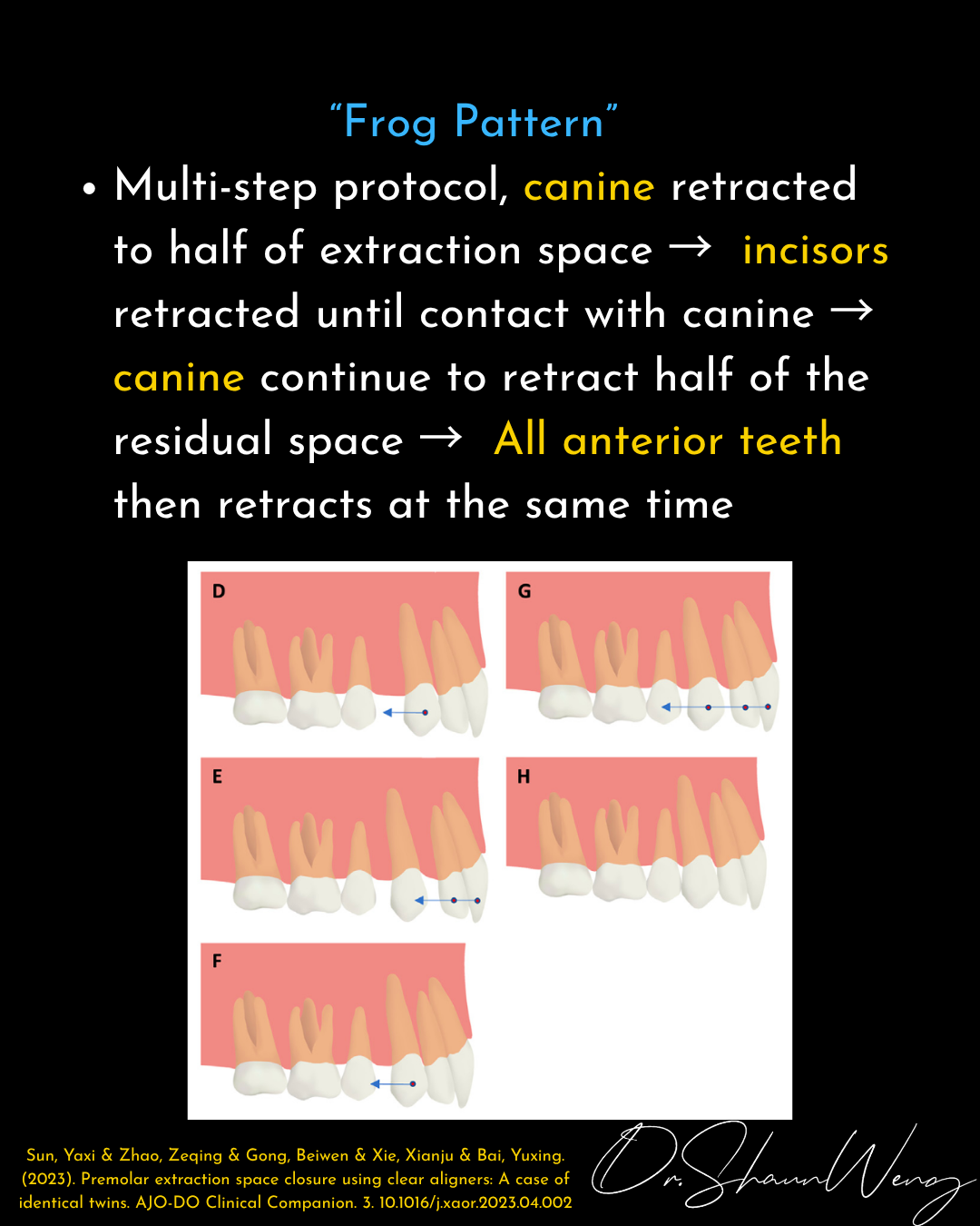 • Multi-step protocol, canine retracted to half of extraction space → incisors retracted until contact with canine → canine continue to retract half of the residual space → All anterior teeth then retracts at the same time